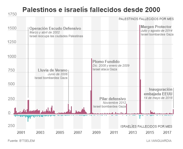 Es relevante recordar en estos momentos las palabras del presidente Trump, quien afirma que la pasada reelección de Netanyahu es “positiva de cara a la paz con Palestina” según sus propias palabras, mientras que en el país judío del medio oriente, su mano derecha nombra a un pueblo en los Altos del Golán, al oeste del país, con el nombre de “Donald J. Trump” no sin antes afirmar que “Israel nunca ha tenido un mejor amigo” que EEUU; sin importarle que del otro lado de la moneda se recogen en 2018 las cifras más altas de muertos y heridos en Palestina por parte de Israel de todos los tiempos, llegando a los casi treinta mil heridos y a los 57 niños y niñas, y jóvenes menores de 18 años acribillados (cifras de la Oficina de las Naciones Unidas para la Coordinación de Asuntos Humanitarios). Esto nos da un total de casi 9500 musulmanes y 1246 judíos que han perdido su vida desde el año 2000 en este conflicto que parece interminable.