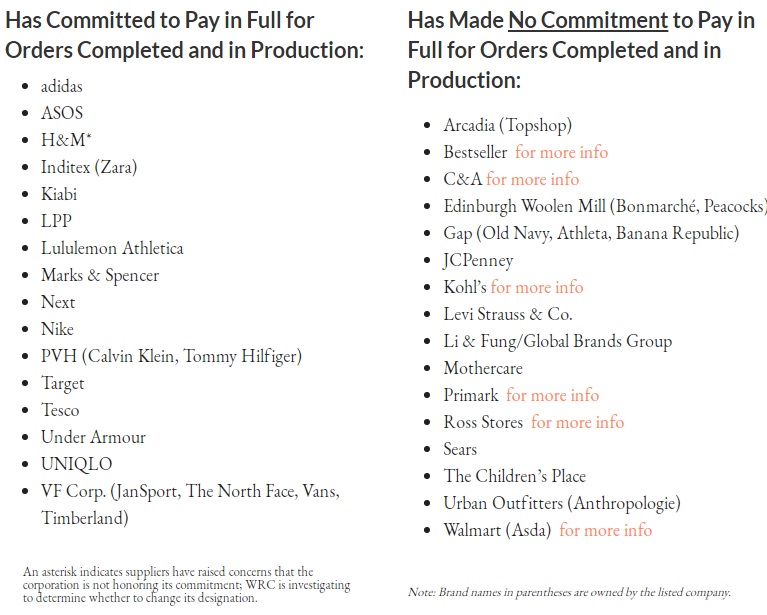 (1) Un estudio del WRC afirma que el más del 72% de los compradores que cancelaron órdenes en proceso de producción se negaron a pagar por las materias primas compradas por los proveedores y un 93% por los cortes, remallados y construcciones de las prendas. El 98% de las empresas se negaron a pagar a los trabajadores que se encuentran suspendidos, en cumplimiento de las medidas gubernamentales para combatir al COVID-19. El 72% de los trabajadores no ha recibido paga alguna.