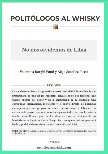 Con el derrocamiento y la posterior muerte de Gadafi, Libia evidencia y es protagonista de uno de los conflictos actuales entre dos facciones que buscan hacerse del poder y de la legitimidad de su mandato. Una comunidad internacional ineficiente y el apoyo directo de potencias extranjeras por sus propios intereses, transformaron a Libia en un escenario de proyecciones externas y una guerra indirecta entre los actores involucrados. Con el paso de los años y el recrudecimiento de las hostilidades se logró un Alto al Fuego. Pero aunque el primer paso está hecho, ¿podrá el sistema internacional no olvidarse Libia?