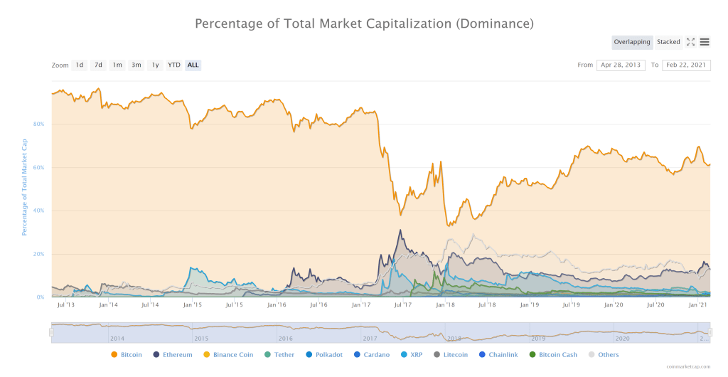 Bitcoin (BTC) es la primera y más popular de las Criptomonedas. De todo el dinero que hay en el mercado de criptomonedas, Bitcoin representa hoy aproximadamente el 61,5%.
