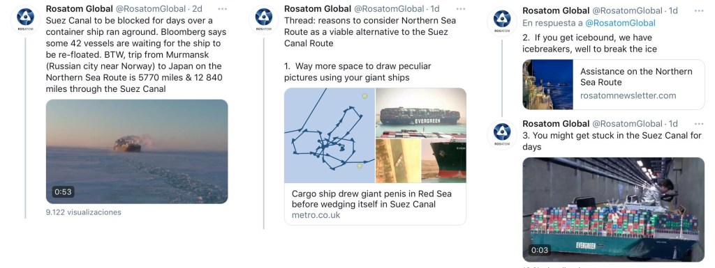 Ante esta situación, buques cargueros de todo el mundo se encuentran varados y muchísimas empresas transportistas se hallan en busca de posibles rutas alternativas (con los costos consecuentes que las mismas pueden acarrear). En esta línea, llaman la atención las publicaciones que Rosatom (agencia nuclear rusa) hizo en su cuenta de Twitter. En la misma publicó: