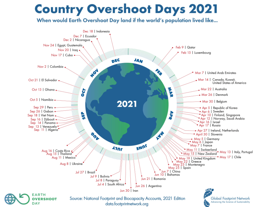Así, el Día del Sobregiro Ecológico de la Tierra no tiene fecha delimitada, sino que es resultado de un cálculo de la biocapacidad del planeta (entre la huella ecológica de la humanidad y los 365 días del año). Mientras que la biocapacidad es un índice que mide la cantidad de recursos que nos ofrece la naturaleza y forman parte de la actividad económica (los suelos de cultivo y pastoreo, los bosques para extraer madera y papel y que absorben el CO₂, las áreas urbanizadas y los recursos pesqueros del mar), la huella ecológica es el índice del impacto que tiene sobre el planeta cada una de las actividades. Por lo que, la sobrecapacidad se produce cuando el consumo es mayor que los recursos disponibles, momento en que se habla de déficit ecológico.