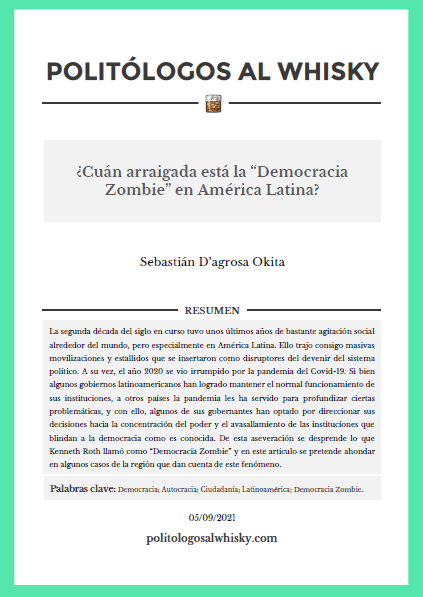 La segunda década del siglo en curso tuvo unos últimos años de bastante agitación social alrededor del mundo, pero especialmente en América Latina. Ello trajo consigo masivas movilizaciones y estallidos que se insertaron como disruptores del devenir del sistema político. A su vez, el año 2020 se vio irrumpido por la pandemia del Covid-19. Si bien algunos gobiernos latinoamericanos han logrado mantener el normal funcionamiento de sus instituciones, a otros países la pandemia les ha servido para profundizar ciertas problemáticas, y con ello, algunos de sus gobernantes han optado por direccionar sus decisiones hacia la concentración del poder y el avasallamiento de las instituciones que blindan a la democracia como es conocida. De esta aseveración se desprende lo que Kenneth Roth llamó como “Democracia Zombie” y en este artículo se pretende ahondar en algunos casos de la región que dan cuenta de este fenómeno.