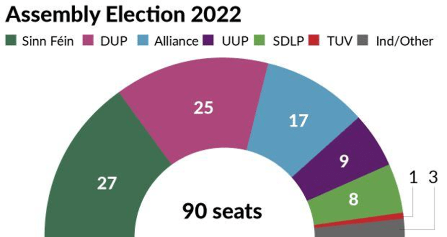 De los 90 escaños que estaban en juego, el Sinn Féin, considerado históricamente el brazo político del Ejército Republicano Irlandés (IRA, por sus siglas en inglés), obtuvo 27 bancas (29% de los votos). En segundo lugar, el Partido Unionista Democrático (DUP) cosechó 25 lugares (21,3%), y más atrás quedaron la Alianza (13,5%), y el Partido Unionista del Úlster (11,2%).