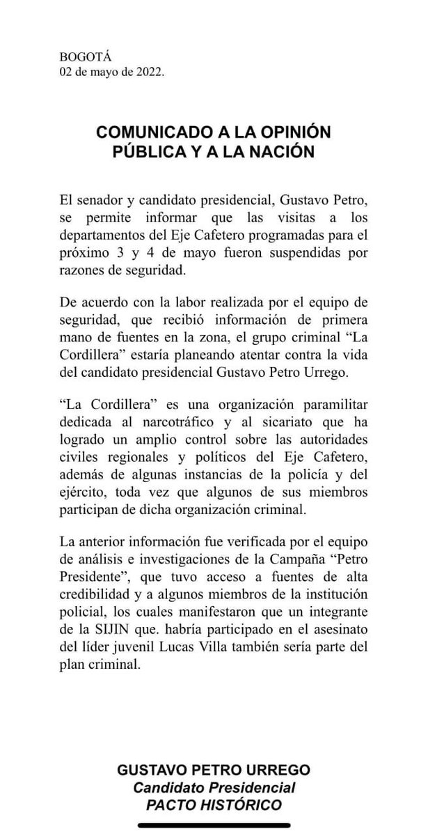 La activa intervención de Procuraduría no ha sido el único hecho en subir la temperatura social de cara a las elecciones. A principios de mayo, Gustavo Petro sorprendió a todo el país suspendiendo una visita a la zona de Manizales los días 3 y 4. La razón, explicada en un comunicado de Pacto Histórico, fue nada menos que un plan para asesinar al gran candidato a asumir la presidencia colombiana.