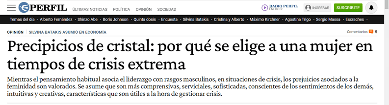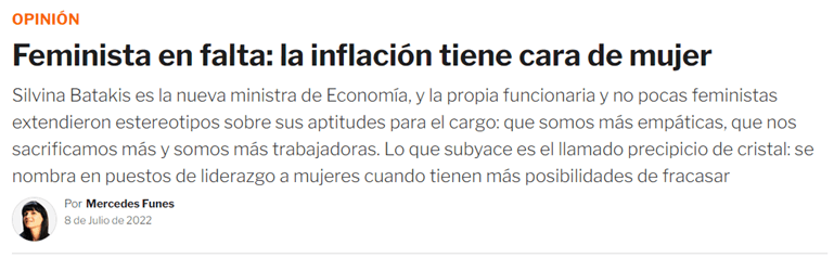 Entre los titulares de los últimos días, por ejemplo, se ha apuntado a la reciente ministra Batakis como producto de una estrategia del gobierno oficialista, apelando a estereotipos de género tales como la “empatía” o la “sensibilidad” como si las mujeres fuesen los únicos seres sintientes del planeta o incluso como si no pudiesen ser meramente racionales. Este tipo de discursos encajan con una mirada juzgadora sobre las mujeres en política donde siempre se le busca un porqué a cómo llegaron al rol que desempeñan. En este caso, por ejemplo, como una “estrategia”, en otros se ha apuntado a la vida sexual y privada de las mujeres, como si siempre se necesitara de algún medio para desempeñar su carrera política.