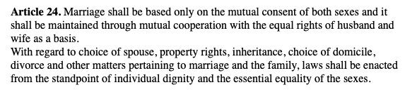 Como se mencionaba previamente, Japón no cuenta con legislación nacional ni vinculante en materia de derechos LGTBI+, lo que incluye el matrimonio entre personas del mismo género. De hecho, la Constitución japonesa en su artículo 24, dice que “el matrimonio debe basarse en el mutuo consentimiento de ambos sexos”, lo que no hace otra cosa que reforzar la invisibilidad de la diversidad familiar.